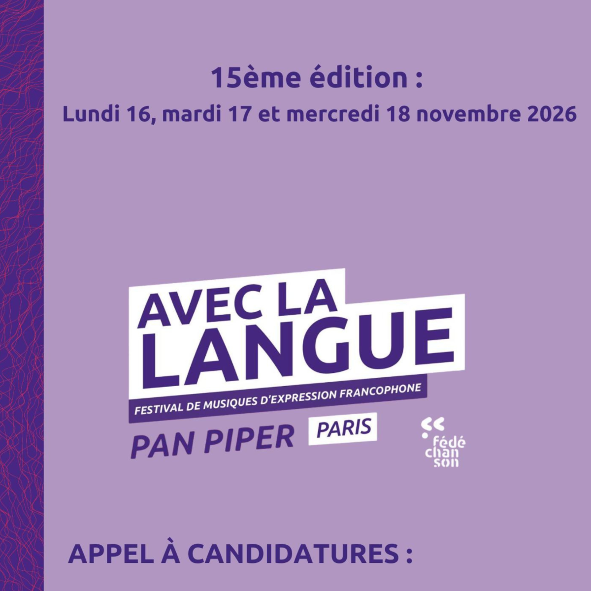 La 15e édition du Festival Avec La Langue aura lieu les lundi 16, mardi 17 et mercredi 18 novembre 2026 au Pan Piper à Paris.