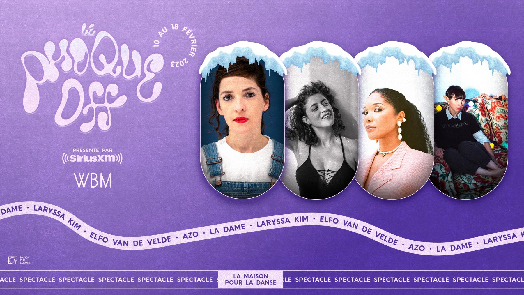 Le Phoque OFF annonce désormais son line-up complet qui inclut 4 artistes issues de la Fédération Wallonie-Bruxelles : Azo, Laryssa Kim, Elfo Van de Velde et La Dame. Celles-ci se produiront chacune en live durant l'événement ainsi qu'en DJ set lors d'une Soirée Club Belge qui les rassemblera (Laryssa Kim sous l'alias Dj Kym Mbémbé et Elfo Van De Velde sous l'alias Hyppocampo) le jeudi 16 février à partir de 22h à La Maison Pour la Danse de Québec.