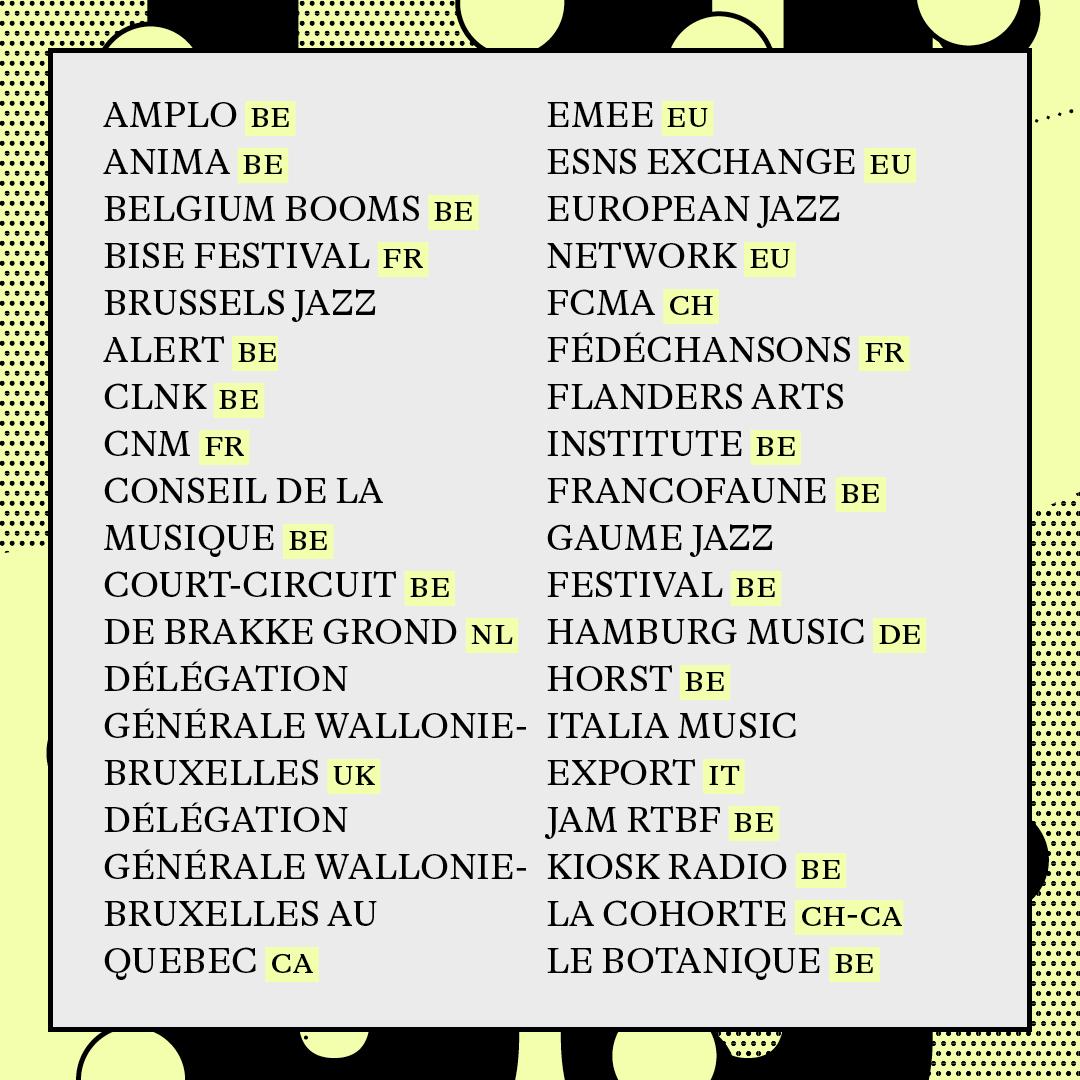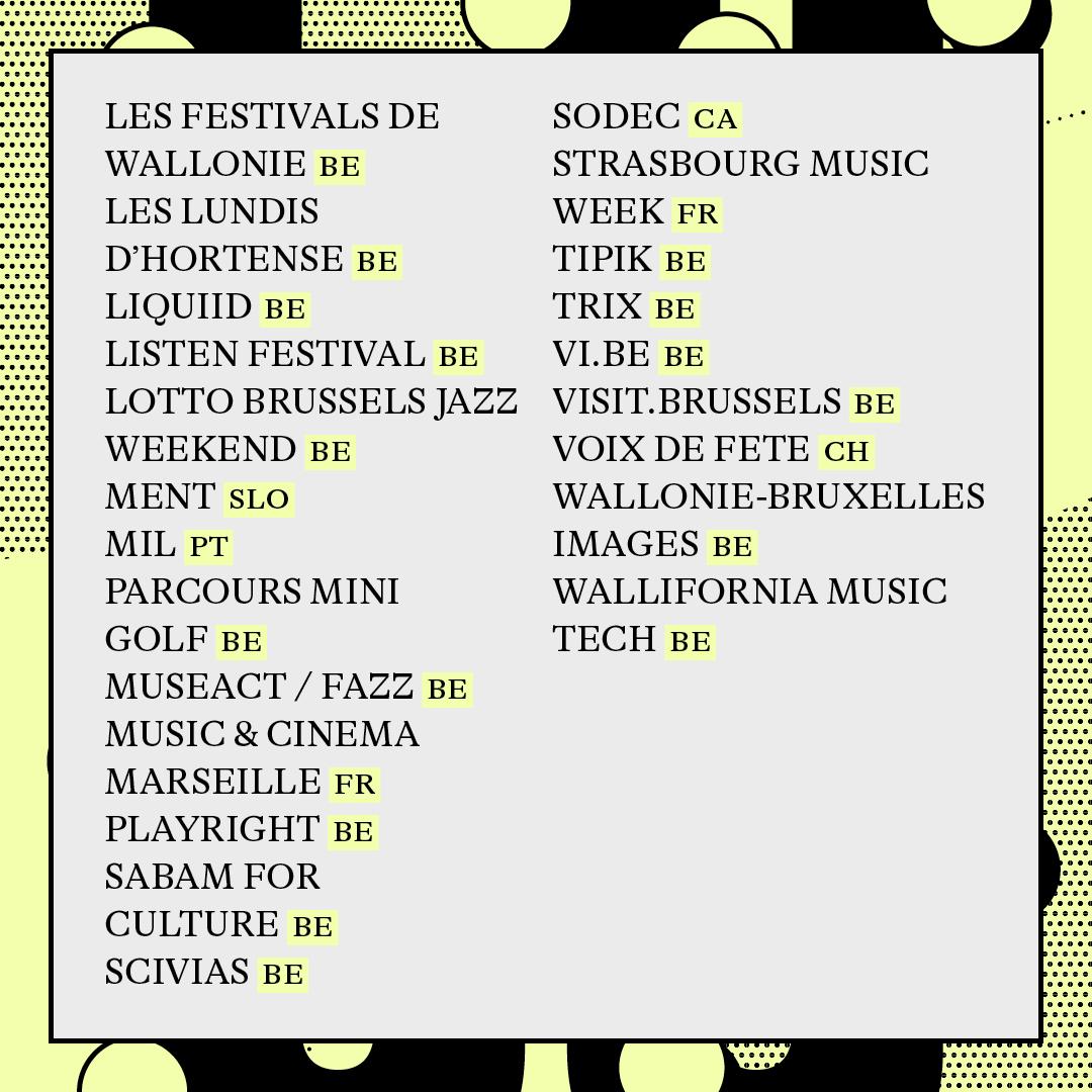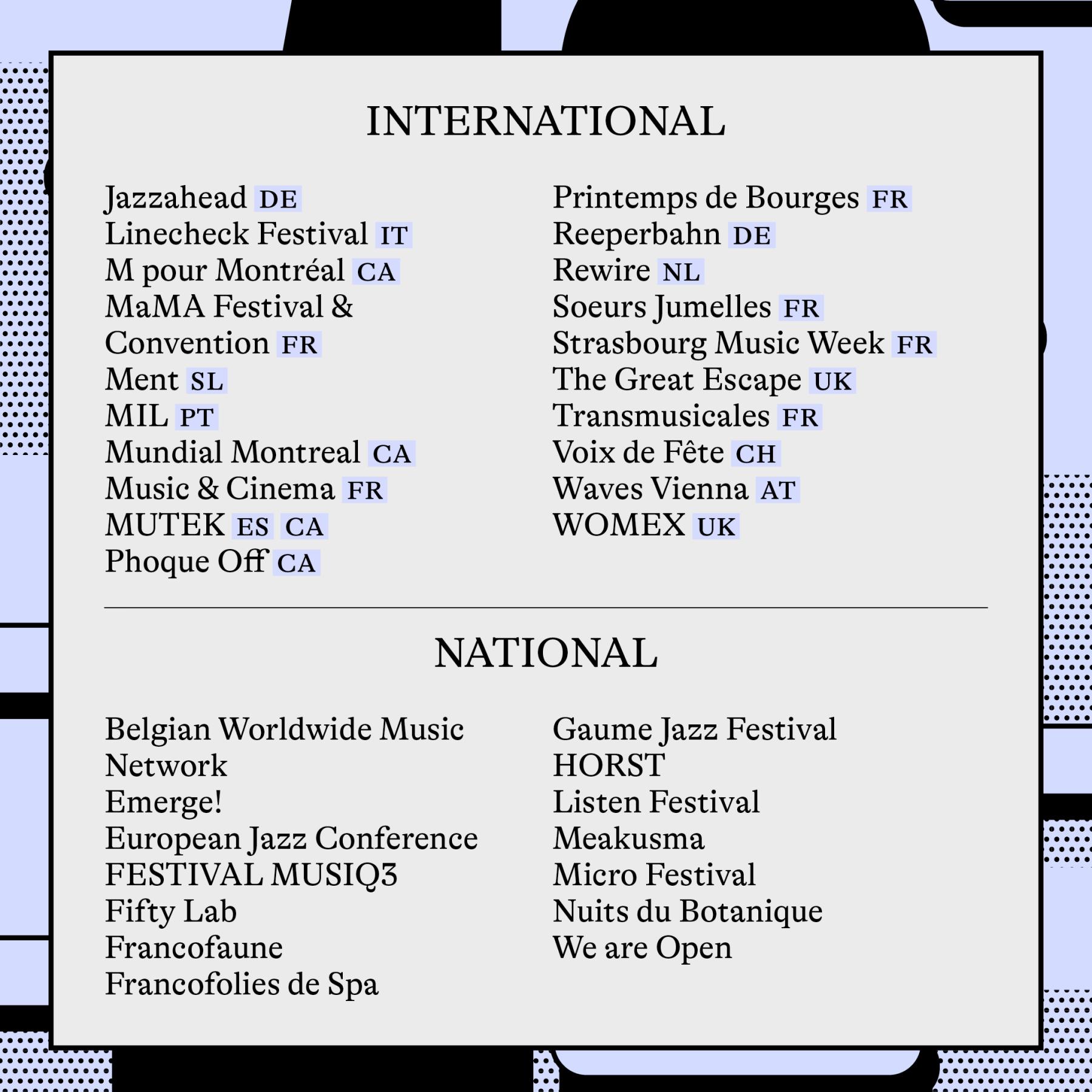 Le secteur est structuré autour de nombreux événements professionnels, en Belgique et à l'étranger. Notre rôle est de sélectionner les propositions pertinentes pour notre marché et d'y monter des actions de mise en valeur ou de réseautage pour notre secteur musical. Ça peut passer par la gestion de stands dans des marchés/foires, la mise en place de délégations professionnelles, l'aide à la programmation, le conseil à la préparation, l'organisation de dîners ou de réceptions, de rencontres formelles, de résidences croisées... En 2024, l'agence a participé à 41 événements, à 8 pour la première fois. En 2025, nous continuerons à prospecter de nouveaux débouchés et à renouveler notre offre de services afin de rester au plus près des besoins du secteur. De nouvelles collaborations sont prévues en musique électronique, dans le secteur des musiques traditionnelles, de la musique classique et contemporaine, du jeune public et de la musique à l'image